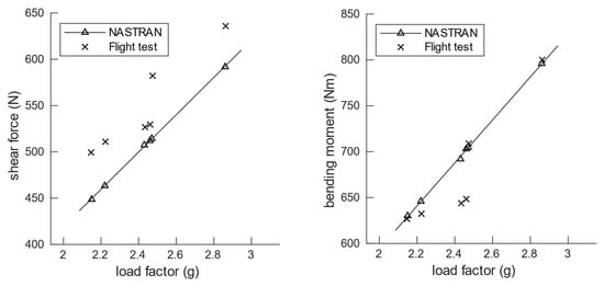 Shear force and bending moment (at wing root—span location 0.108 m) at different flight test manoeuvres for the reference wing.