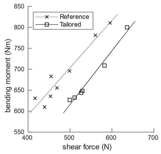 Root bending moment vs. shear force for the reference and tailored wings.
