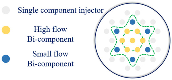 To explore the influence of the mass flow rate amplitude and flow rate distribution on the combustion instability of the hypergolic propellant combustion chamber, all the schemes are obtained by making minor adjustments to the basic scheme of the combustion chamber in this section. For the basic scheme, the entire combustion chamber is composed of 31 injectors, characterized into three types: (a) 18 single-component fuel injectors in the outermost ring; (b) 6 coaxial swirling injectors with a small oxidant flow rate whose mixing ratio is 0.302, located in the middle ring; and (c) 7 coaxial swirling injectors with a large oxidant flow rate whose mixing ratio is 0.649, located in the center. The schematic diagram is shown in Figure 3.