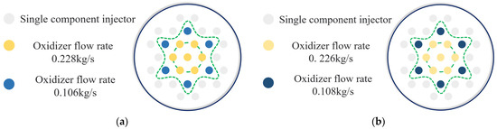 In order to explore the influence of the oxidant radial flow rate gradient, the flow rate scheme is set according to the following rules: the fuel flow rate of all injectors is fixed, and in each circle, the flow rate of each injector is kept the same; and the oxidant flow rate of the central 7 bi-component injectors and the oxidant flow rate of the six bi-component injectors in the outer ring are changed, as shown in Figure 5. According to Table 4, three different flow rate distributions are used, and the table also shows the flow rate of the typical injectors.