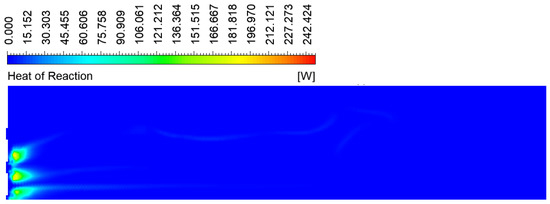 Schemes 1, 3, and 4 applied flow rate oscillations with amplitudes of 10%, 20%, and 30% to the oxidant circuit, and the flow rate distributions were the same, respectively. Figure 7 shows the heat release rate distribution of Scheme 1. It can be observed that the heat release rate is concentrated in the head region of the combustion chamber, with a certain continuation along the longitudinal direction.