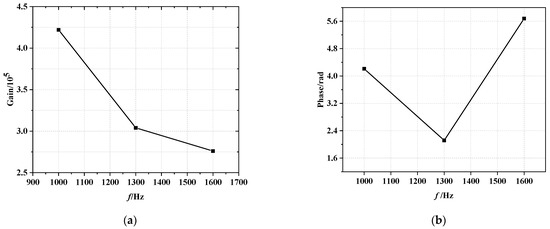 The heat release rate distribution of each injector within 2 ms is extracted, and then the effective parameters are obtained according to the flame transfer function introduced in Section 2.1.2. This duration is chosen to cover at least one full cycle of the three frequency simulations. Figure 8a,b are, respectively, the amplitude–frequency characteristic curve and the phase–frequency characteristic curve of flame transfer function, taking the central injector as an example.