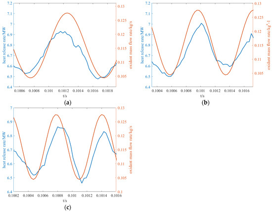 Due to the circumferential unevenness of the flow rate distribution, it maintains the center symmetry, but the minimum simulation unit is 1/3 of the combustion chamber. This section uses 1/3 combustion chamber geometry model for simulation with a grid of 4 million. The combustion field steady simulation of Schemes 5 and 6 are carried out to obtain various thermodynamic parameters, and the steady state frequency is roughly estimated according to Equation (20). Since the flow rate distribution does not change much and the structure of the combustion chamber is the same, the steady state characteristic frequency is similar to that of Scheme 1. Therefore, according to the steady state characteristic frequency, the inlet flow rate oscillations of 1000 Hz, 1300 Hz and 1600 Hz frequency are also selected. Figure 10 takes Scheme 5 as an example to show the relationship between the sum of heat release rate in the computational domain and the inlet flow rate pulsation at three frequencies. The processing method described in Section 4.1.2 is used for calculation, and the characteristic frequency and growth rate of the three schemes are shown in Table 7. From Scheme 1 to Scheme 5 and Scheme 6, the circumferential flow rate distribution changes from uniform to uneven, and the combustion of the three schemes are all unstable, with the absolute value of the growth rate being greater than that of Scheme 1, but the combustion instability does not increase with the aggravation of unevenness. Therefore, the circumferential unevenness of the flow rate distribution is unfavorable to the combustion stability in this combustion chamber, while the influence of the circumferential unevenness of the flow rate distribution on the stability is not monotonic.