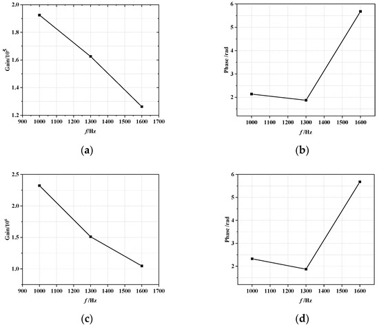 The flame transfer function of the central injector. (a) The amplitude–frequency curve of Scheme 7. (b) The phase-frequency curve of the Scheme 7. (c) The amplitude–frequency curve of Scheme 8. (d) The phase–frequency curve of the Scheme 8.