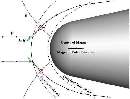 Hypersonic flight technology is attracting increasing attention from major countries worldwide due to its vast potential value for military and civil applications. However, the enormous aerodynamic heating severely restricts the further development of hypersonic vehicles []. During the hypersonic flight, the weakly ionized plasma with certain electrical conductivity formed behind the detached bow shock provides the possibility for flow control by applying an external magnetic field. In the 1950s, Resler and Sears pointed out the potential of magnetohydrodynamics (MHD) flow control technology in aerospace applications for the first time []. The diagram view of MHD flow control around a blunt body is shown in Figure 1. Under the effect of the eternal magnetic field, there is the electric current in the weakly ionized plasma flow behind the detached shock. The interaction between the induced electric current and external magnetic field generates the Lorentz force, which decelerates the flow behind the shock and pushes the bow shock away from the blunt body, leading to a significant influence on the aerodynamic heat load on the surface of the vehicle. In the 1990s, with the development of hypersonic vehicles and the advancement of superconducting material technology, MHD heat flux mitigation drew extensive attention as a potential thermal protection technology to reduce hypersonic aerodynamic heating.