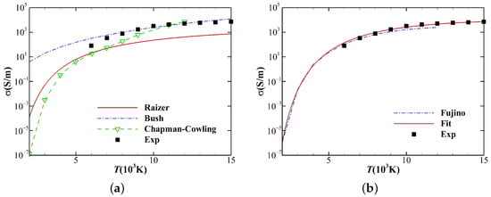 Electrical conductivity, as a transport property of plasma, quantitatively describes the ease of directional conduction of charges in plasma. The accurate calculation of the electrical conductivity is critical for MHD flow simulations. Temperature-dependent semi-analytic models are generally employed, and the representative models are the Chapman–Cowling model, Bush model, Raizer model, etc. []. These semi-analytic models are computationally efficient, but as shown in Figure 2a, all these models deviate to some extent from the experimental data and have poor generality and limited applicability.