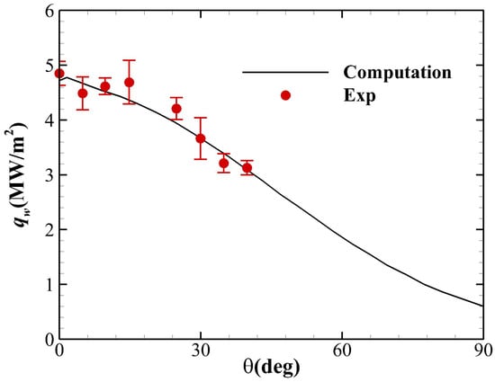 The hypersonic aeroheating experiment for a cylinder performed by Klaus et al. is simulated first, and the diameter of the cylinder is 90 mm and the length is 380 mm. The flow conditions are given as , K, and Pa, respectively. The total temperature of the incoming flow exceeds 10,000 K, so the chemical non-equilibrium effect must be considered in this case. The mass fractions of each species in the freestream are . The isothermal wall boundary condition is adopted for the cylinder surface with K. Figure 3, with the comparison of measured and numerical result of surface heat flux, shows that the numerical code used in this paper can accurately predict the surface heat flux considering the chemical nonequilibrium effects.