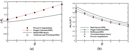For the inviscid situation, the variation of the shock stand-off distance with Q is shown in Figure 5a, where Q is the magnetic interaction parameter given by Equation (14) and is a measurement of the ratio of Lorentz force to inertia force in the flow. It can be seen that good agreement is achieved between the present computational results and the ones obtained by Poggie and Gaitonde. Meanwhile, it is seen that all of the numerical results are higher than those predicted by Bush’s theory, and Poggie and Gaitonde attributed these deviations to the assumption of constant density in the shock layer in Bush’s theory. Furthermore, Figure 5b shows the tangential velocity gradient distribution at the stagnation point, which shows good agreement with the Bush theoretical results qualitatively and also with other numerical simulation results.