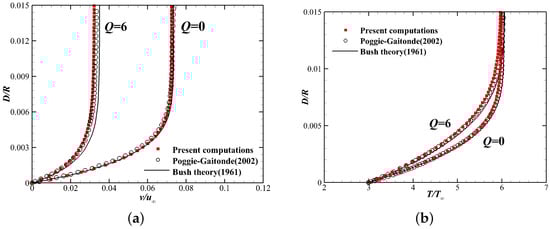 For the viscid situation, the boundary layer profiles of velocity and temperature for a station close to the center line () are shown in Figure 6, and fairly good agreement is also achieved between the present computations and Bush’s theory.