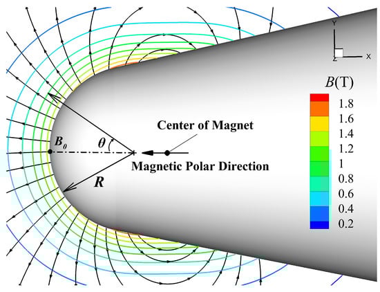 A typical sphere–cone blunt body, with a nose radius of 50 mm and a half cone angle of is employed for numerical simulations, and the total length of the blunt body is 1.5 m. The dipole magnet is adopted, pointing against the direction of incoming flow, and the distribution of magnetic field follows the expression given as Equation (15), where is the magnetic field intensity at a distance from the center of magnetic dipole on the polar axis. The dipole magnet is located at , setting () to . The spatial distribution of magnetic field intensity is shown in Figure 7, where the magnetic field line is represented by the solid black line. The freestream conditions are given in Table 1. The wall is set to be electrically insulated, non-catalytic, and isothermal with K. Since the model, the freestream conditions, and the magnetic field distribution are axisymmetric, the governing equations in axisymmetric form are employed to solve these hypersonic MHD flows.