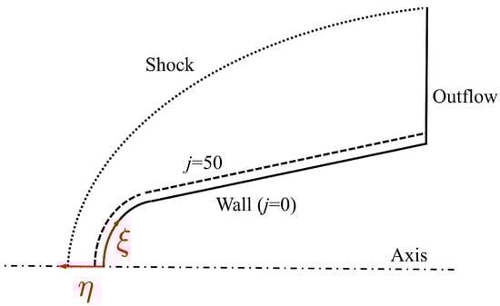 The governing Equations (1)–(4) are solved using an in-house code ACANS, a finite difference CFD code developed by Gao et al. []. The reliability of ACANS was verified by a variety of simulations, and the details of the code can be found in [,,]. In the present numerical simulations, the inviscid flux vectors are discretized using the Roe scheme [], and the monotone upstream-centered scheme for conservation laws method [] is adopted to achieve second-order precision. The viscous flux vectors are discretized by the second-order central-difference scheme. The implicit lower–upper symmetric Gauss–Seidel method [] is employed for the time marching. For the chemical kinetic model of high-temperature air, a single-temperature chemical non-equilibrium kinetic model of 7 species (N, O, NO, N, O, NO, e) and 11 elementary reactions is used in this paper. The thermodynamic parameters of each component and the rate constants of elementary reactions are detailed in the literature []. In addition, the equation of is discretized by the second-order central-difference scheme and solved by the successive over relaxation method.