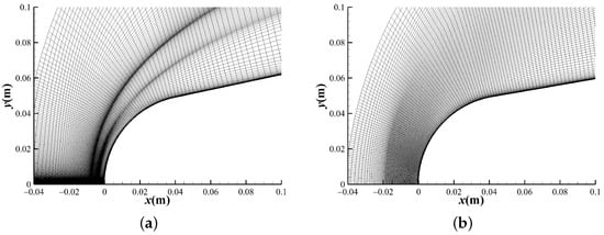 Due to the different chemical kinetic models used, the flow fields of the cases of Group A and Group B are also different, especially the position of the detached bow shock. For accurate simulation of each case, mesh A and mesh B are used for the simulation of Group A and Group B, respectively; the meshes of their head regions are shown in Figure 9. In order to accurately calculate the surface heat flux, the grid height in the direction of near the wall is set to m for both meshes. Mesh A densifies the mesh at the two positions where the bow shock wave appears, the grid height in the direction of near the shock wave is set to m, and it has 300 points in the direction of and 150 points in the direction of ; mesh B densifies the mesh within the range (∼0 m) where the bow shock wave may appear, the grid height in the direction of in this area is set to m, and it has 200 points in the direction of and 145 points in the direction of .