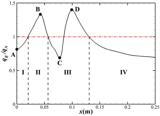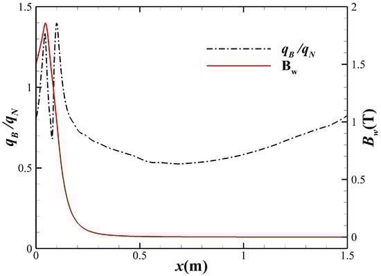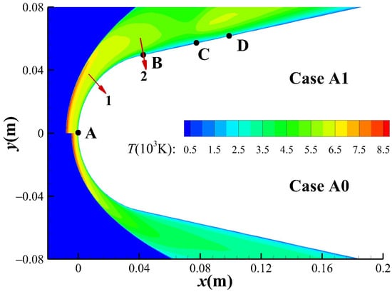 The flow field comparison with and without an external magnetic field (Case A0 and Case A1) is shown in Figure 10. It can be seen that the temperature in the shock layer increases slightly, while the shock stand-off distance is significantly increased under the effect of an external magnetic field. As shown in Figure 11, the surface heat flux distribution is changed significantly due to the external magnetic field. Further, the distribution of relative heat flux is shown in Figure 12, where and are the surface heat flux with and without an external magnetic field, respectively. The red dotted line represents , which can divide the wall into four zones shown in the figure. In Zone , the surface heat flux is significantly reduced, and the drop at stagnation point reaches 18.7%. However, in Zone , the shoulder region, the surface heat flux increases instead, and the rise at point B reaches 33.7%. After that, the new trough C and peak D of appear in Zone . In Zone , is always less than 1, which indicates that the external magnetic field can still effectively reduce heat flux in this region. From the above results of relative heat flux distribution, it can be concluded that the external magnetic field can indeed effectively reduce the heat flux at stagnation point, but it may increase heat flux in the downstream area of stagnation point. The above phenomena suggest that the influencing mechanism of external magnetic field on the surface heat flux may differ in different zones of the blunt body.