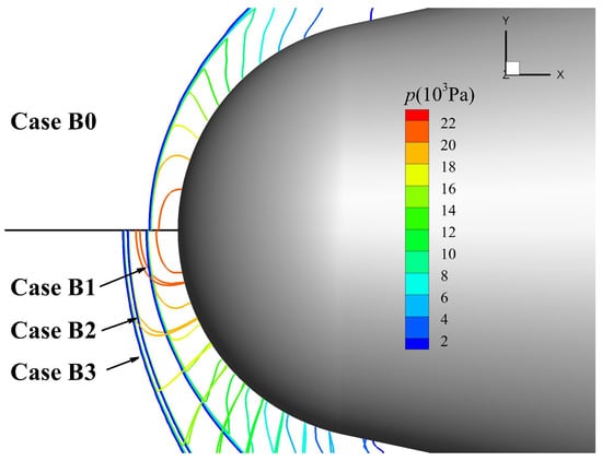 As mentioned in the Introduction, the current mainstream view generally attributes the reduction of stagnation point heat flux to increase of shock stand-off distance due to the external magnetic field. This section will discuss whether this explanation is correct by the result of numerical experiments corresponding to the cases of Group B, the set-ups of which are shown in Table 2. These cases investigate the effect of magnetic interaction when it acts in different regions. Figure 13 is the pressure contours of Group B cases. It can be seen that there are significant differences in the shock stand-off distance when constant electrical conductivity is added in different regions. The shock stand-off distance increase rate (SDIR ) and heat flux decrease rate (HFDR) of each case are shown in Table 3. The SDIR and HFDR are defined by Equations (16) and (17), where and are the shock stand-off distance with and without the external magnetic field, respectively, while and are the stagnation point heat flux with and without the external magnetic field, respectively.