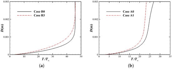 It can be seen from Table 3 that SDIR and HFDR have a lack of sufficient correlation under the external magnetic field. SDIR of Case B2 is significantly larger than that of Case B1, but both HFDRs are similar. SDIRs of Cases B2 and B3 are similar, but the HFDR of Case B3 is about twice that of Case B2. Therefore, from the results, there is no direct relationship between the increase in shock stand-off distance and the decrease in stagnation point heat flux. It can also be seen from the table that the shock stand-off distance of Cases B2 and B3 are relatively close, which indicates that the magnetic interaction in the inviscid flow outside the near-wall region is the main reason for the increase in shock stand-off distance. The physical reason is as follows: the temperature behind the shock will increase under the effect of external magnetic field as shown in Figure 13, which then leads to an increase in the speed of sound behind the shock and thus to an increase in the shock stand-off distance.