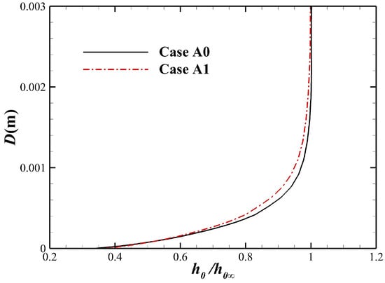 In fact, the Lorentz force can be decomposed into two components: the counter-flow Lorentz force along the streamline and the normal one perpendicular to the streamline, where the counter-flow component will decelerate the flow within the entire shock layer, which is equivalent to an additional inverse pressure gradient in the boundary layer downstream near the stagnation point, and this inverse pressure gradient will lead to an increase in the boundary layer thickness. Figure 14 shows the temperature boundary layer profiles at stagnation point under the perfect gas and chemical nonequilibrium model, respectively. It can be seen that the increase of boundary layer thickness significantly reduces the surface temperature gradient. Moreover, Figure 15 shows the total enthalpy boundary layer profile at stagnation point when the chemical nonequilibrium effect is considered, and the increase in boundary layer thickness can be seen more clearly.
