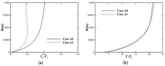 The electromagnetic source terms in Equation (4) can be written in the form as Equation (18), which indicates that the energy introduced by external electromagnetic field is divided into two parts, which are the work done by Lorentz force on fluid elements and the Joule heating generated from electrical current. The Lorentz force is equivalent to adding a new dissipation mechanism in the flow: that is, the counter-flow Lorentz force decelerates the fluid elements behind the shock, and the reduced kinetic energy will be totally converted to internal energy through Joule heating at the condition of , leading to an increase in the static temperature of the fluid elements. This physical process is referred to as ‘electromagnetic dissipation’ in this paper, which will have a significant effect on both the velocity and temperature distribution within the boundary layer.