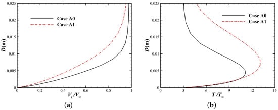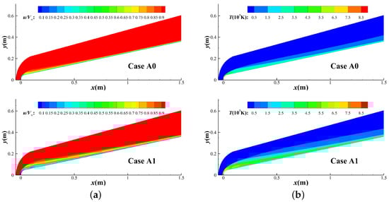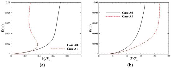 The velocity and temperature profiles in the boundary layer at Station 1 are shown in Figure 16, where the tangential velocity is given as Equation (19). It can be seen that, under the effect of electromagnetic dissipation, the velocity at the outer edge of boundary layer decreases significantly, and the static temperature of inviscid flow increases slightly. Although the static temperature at the outer edge of boundary layer has increased for this station, the surface heat flux still decreases by 11.28%. Figure 17 shows further downstream boundary layer profiles at Station 2, which can be found that the electromagnetic dissipation effect becomes stronger at this station, with a greater decrease in tangential velocity and a more significant increase in static temperature for the inviscid flow. Obviously, the increase in boundary layer thickness caused by the external magnetic field is no longer the dominant factor affecting the surface heat flux. In contrast, the increase in static temperature of the inviscid flow caused by Joule heating becomes the dominant factor, which increases the temperature gradient in the boundary layer significantly, resulting in an increase in surface heat flux. It can also be seen that due to the substantial increase in the temperature of the inviscid flow, the electrical conductivity and the Lorentz force outside the boundary layer will also increase, making the inviscid flow velocity smaller than the velocity in boundary layer, that is, the so-called “Speed Overshoot” phenomenon [].