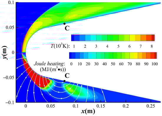 As mentioned above, Joule heating plays an important role in the distribution of energy in the flow field. The magnitude of Joule heating depends on the electrical conductivity, velocity, magnetic field intensity, and the angle between magnetic field line and streamline as given in Equation (20). Figure 18 shows that the magnetic field line, represented by solid white line, is roughly parallel to the direction of streamline near point C, resulting in weak Joule heating in this region. Hence, the temperature in the area near point C is relatively lower. At this time, the effect of Joule heating on the heat flux is no longer dominant, so the relative heat flux at point C drops to less than 1 again.