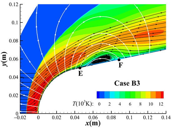 In addition, for the cases that the magnetic interaction above the shoulder region is still strong, such as the B3 case, the Lorentz force component normal to the streamline would likely change the flow state and thus affect the surface heat flux. As shown in Figure 19, the streamlines of case B3 obviously separate from the surface near shoulder region, causing the high-temperature gas to move away from the wall surface, where the heat flux decreases significantly.