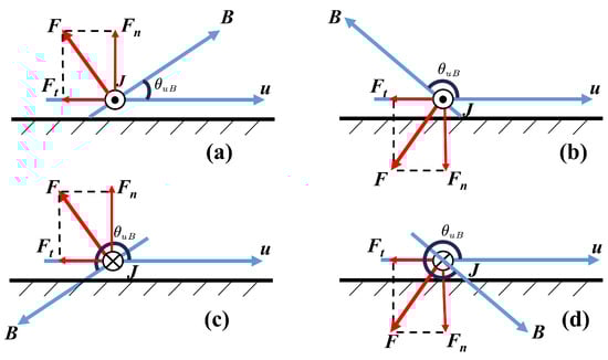 Schematic diagram of the Lorentz force: (a) . (b) . (c) . (d) .