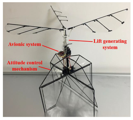 Due to the high aerodynamic efficiency and various lift mechanism of a flapping wing at low Reynolds number, the micro flapping wing MAVs, which directly mimic the flapping creatures, have developed rapidly [5,6,7]. Phan et al. [8] designed a stable 21 g insect-like tailless flapping wing MAV, which equips three steering gears to adjust wing kinematics and realizes stable hovering within a 0.3 m ground radius. Tu et al. [9] used motors to drive the wing directly, and realized the stable flight by precise motion control of a pair of bio-inspired decoupled wings. Ma et al. [10] built an 80 mg flapping-wing robot modeled on the morphology of flies and demonstrated constrained stable hovering and basic controlled flights, and they achieved an untethered flight of an improved flapping-wing robot in 2019 [11]. Wagter et al. [12] designed DelFly Explorer—a 20 g flapping-wing MAV, which integrates a 0.98 g autopilot and a 4 g onboard stereo vision system to perform autonomous flight. Karásek et al. [13] in the same research team built DelFly Nimble, a tailless flapping wing MAV that demonstrates high maneuverability in flight.