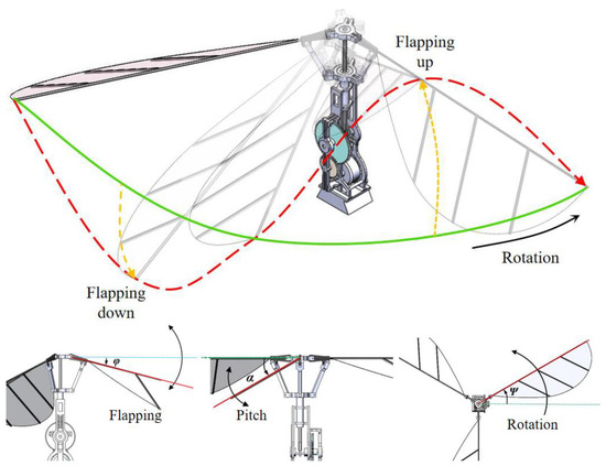 The three-wing FWR-MAV consists of three parts: the lift generating system, attitude control mechanism and avionic system, as shown in Figure 1. The lift generating system mainly generates active flapping motion, passive rotation motion, and passive torsion of the wings to gain lift force, as shown in Figure 2. The attitude control mechanism is designed to improve the stability and control the attitude of the MAV. The avionic system senses the MAV’s attitude and receives remote signals, and then outputs control signal to control the brushless motor and steering gear deflection angle.