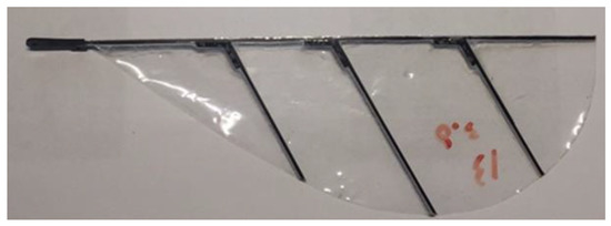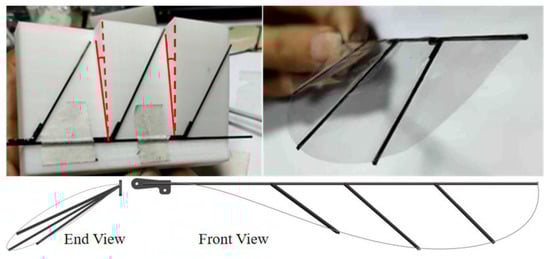 The wing of the FWR consists of a carbon fiber main beam, three carbon fiber auxiliary beams and a thin polyethylene film wing surface (Figure 4). The root of the wing is installed on the wing root part cut from carbon fiber board, and the attack angle of the wing is formed by the angle between the wing surface and the installation plane of the wing root part (Figure 5). In previous research, all three auxiliary beams were on the same plane. The FWR has some aerodynamic characteristics similar to the rotary wing, so adding torsion to the wings of the FWR such as the screw blade might also obtain better aerodynamic performances. In order to explore the influence of wing torsion, special molds are used to place auxiliary beams in different planes, then the torsional wing is obtained (Figure 6).