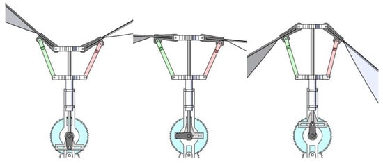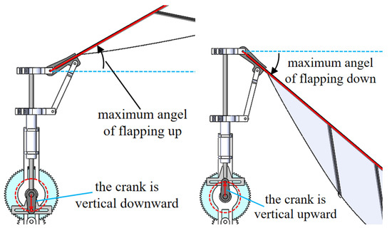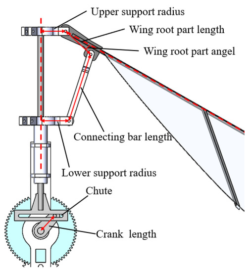 The flapping rotary mechanism of this prototype is a combination of crank-chute mechanism and four-bar linkage mechanism, as shown in Figure 7. The gear drives the crank to rotate, and the crank-chute mechanism converts the rotary motion of the crank to the reciprocating motion of the slide bar. The upper support is fixed at the top of the slide rod, while the lower support is fixed at the top of the sleeve. Through the transmission of wing root parts and connecting bars, the reciprocating motion of the slider bar and upper support is converted into the flapping motion of the wings.