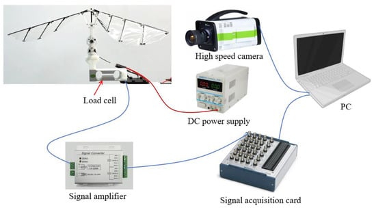 The lift test bench is mainly composed of a flapping wing rotor experimental prototype, a single degree of freedom load cell, a signal amplifier, a high-speed camera, a signal acquisition card, regulated power supply, a computer, and a bench system.