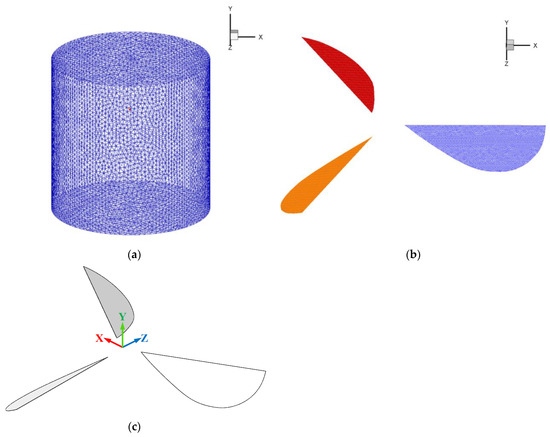 In order to calculate the flow field of the flapping wing rotor and compare it with the lift obtained by experiment, a CFD model was built. The shape and size of the wing model used in the numerical simulation are the same as the experiment model. The CAD geometry of the computational model and the meshing model is shown in Figure 10. The fluid calculation domain is a cylinder with a diameter of 3 m and a height of 3 m. Based on the dynamic mesh function in Fluent software, the wing motion mode of the FWR was simulated. Unstructured mesh was adopted for simulation calculation, and the total number of meshes was about 1.5 million. Compared with structural mesh, unstructured mesh is easier to adapt to complex geometric structures and more convenient to generating a dynamic mesh. CFD simulations were based on Reynolds-averaged Navier Stokes (RANS) equations combined with SST k-ω turbulence mode [20].