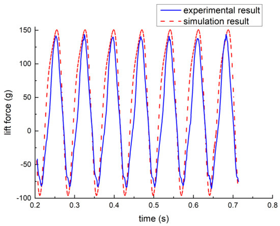 In order to verify the effectiveness of the CFD, typical working conditions are selected for verification. Figure 11 shows experiment results corrected by Kalman filtering and CFD results when fflap is 14.5 Hz, frot is 14.2 rps, φ0 is 0°, ∆φ is 70.3°, α0 is 20°, and ∆α is 5°. The experimental result is slightly different from the CFD simulation. The average lift of the CFD simulation is 25.48 g which is 2.79% different from the experimental value of 26.21 g. These differences are mainly due to the limited measurement of the wing motion and especially the real-time passive torsion of the wings.