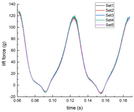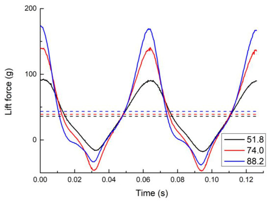 In Figure 23, the solid lines are the actual lift data measured by experiments, and the dashed lines are the corresponding average lift forces. It is not difficult to see that the maximum value of the lift force to becomes higher while the flapping amplitude becomes larger. However, the average lift force variation of different flapping amplitudes is much smaller than the actual experimental measurement.