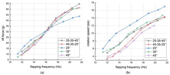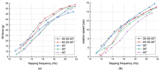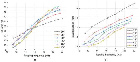 The influence of wing attack angle of the FWR: (a) The flapping frequency-lift force line chart; (b) the flapping frequency-rotation speed line chart.