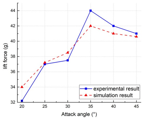 In order to verify the lift advantage of the wing with attack angle of 35°, CFD simulation was performed on the wing at different attack angles under typical working conditions. The flapping frequency of 18.0 Hz (the three-wing FWR with 25° wings can hover at this flapping frequency in the flight test) was chosen as a basic parameter. The other parameters of wings with different attack angle are shown in Table 2. The rotation speed was taken from the experimental results and endowed the CFD simulation as the corresponding motion mode. Figure 14 shows the lift force of the experiment and CFD results with different attack angle of wing at the flapping frequency of 18.0 Hz.