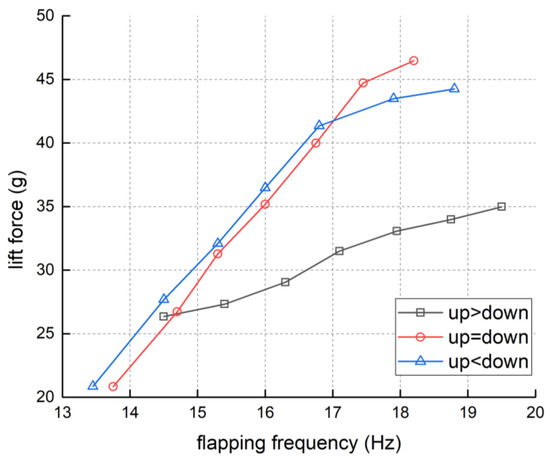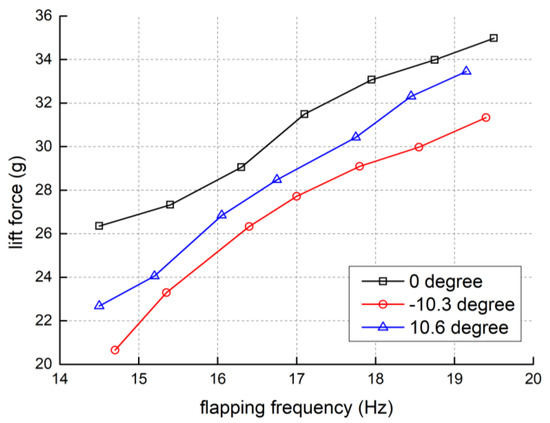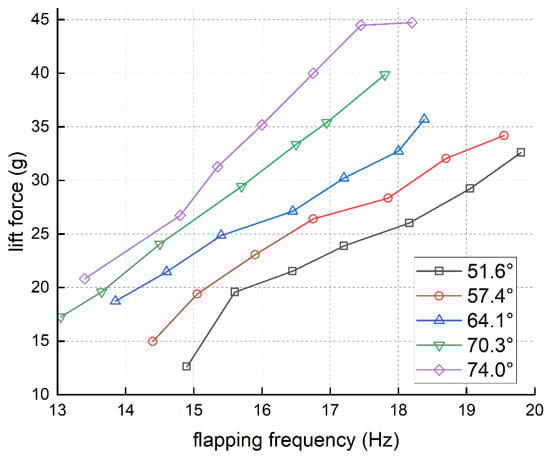 The results in Figure 22 show that the lift force increased with the growth of the flapping amplitude in general. With the growth of the flapping amplitude, the slope of the flapping frequency-lift force line increased gradually, which means the flapping effectiveness was improved. At the same time, large flapping amplitude could not achieve high flapping frequency based on this FWR model. It also demonstrates that driving larger flapping amplitude needs more power consumption. Note, the lift force with flapping amplitude of 82.4°, 88.2°, and 96.2° were studied as well. Nevertheless, the transmission structure of the proposed FWR cannot handle such aggressive flapping amplitudes. In fact, as flapping amplitude exceeds 80°, it is highly possible to damage the transmission mechanisms, causing few effective data.