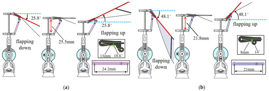 Schematic of the flapping amplitudes: (a) Flapping amplitude of 51.6°; (b) flapping amplitude of 92.6°.
