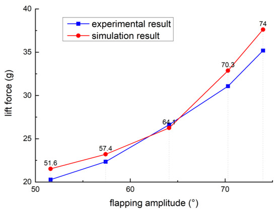 As can be seen from the figure, the CFD simulation value after passive torsion angle correction is highly consistent with the experimental value. The flapping amplitude increased from 51.6° to 74°, and the experimental and CFD results gradually increased from 20 g to 35 g, which was consistent with the conclusion in the literature [18], and the growth rate also kept increasing. The mean absolute percentage error between the experimental result and simulation result is 5.06%. A larger flutter amplitude will produce a larger lift force, which is completely applicable to the FWR. Consequently, once the strength limitation of the transmission structure can be addressed, the lift can be further improved by keeping increasing the flapping amplitude.