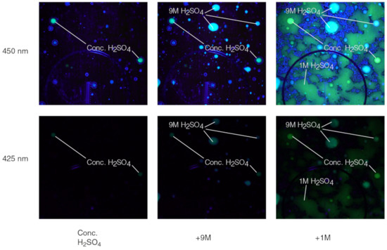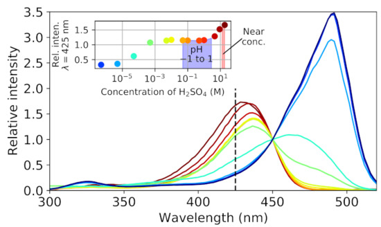 It can be seen from the excitation spectrum (Figure 5) that the acidification of the solution led to a shift in the peak towards shorter wavelengths. The inset shows the relative emission intensity between 425 and 450 nm (), which shows monotonic behavior based on sulfuric acid concentration. The pH range corresponding to the hypothesis about the partially neutralized droplets (pH in the range between −1 and 1) lies on the plateau at around 1.1 and concentrated sulfuric acid is expected to give a signal around 1.6, allowing for clear distinction between the two signals. In the experiment, we used concentrated sulfuric acid as the most acidic case, although the non-neutralized droplet case is expected to be around 80%. However, as can be seen from the Figure 5 inset, the behavior of slightly diluted solutions is expected to be similar to that of the concentrated case.