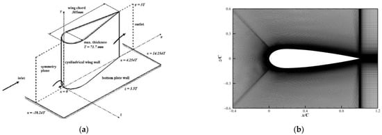 The inflow boundary is placed at x/T = −18.24, and the BL is set the same, using the velocity profile experimentally measured. The inlet flow corresponds to a two-dimensional BL developing under zero pressure gradient conditions, for which the methodology is the same as in Paik et al. [28]. The outlet is at x/T = 14.254, and non-reflecting characteristic boundary conditions are applied. The lateral boundaries are placed symmetrically concerning the wing vertical plane of symmetry at z/T = ±3.5, and the up plane is also set as a symmetry boundary. No-slip boundary conditions are applied on the bottom wall and the wing surface.
