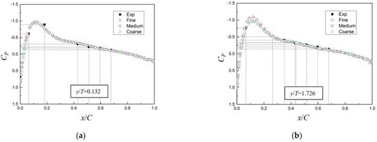 Figure 2 compares the mean pressure coefficient Cp calculated by SLA-IDDES using the three different grids at positions y/T = (a) 0.132 and (b) 1.726 on the wing; the corresponding experimental results are shown by the black circles and dashed lines. As can be seen, all three grids give results that agree well with the experimental ones, but to provide more details about the structure of the JF, reported below are the results obtained with the fine grid.