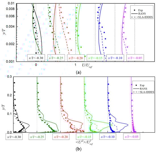 Figure 3a,b shows the mean streamwise velocity and Reynold stress on the symmetry plane at the leading edge region. It was found that the SLA-IDDES method obtained a better result than RANS; in particular, the velocity profile matched well with the experimental measurement. Although the Reynold stress was very different compared with the experiment, the tendency was basically the same and was much better than the RANS result.