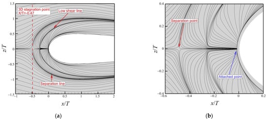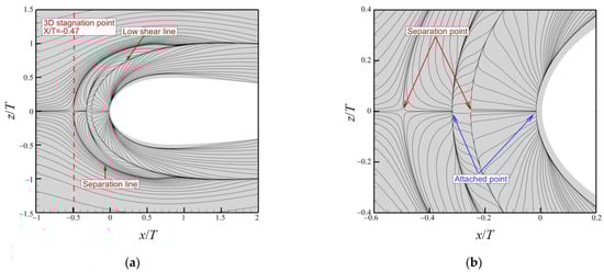 According to Devenport and Simpson. [4], the mean streamlines of the JF have three obvious characteristics: the leading region contains (i) a separation line and (ii) a low-shear line, and (iii) there is a fishtail-like wake. The locations of the 3D stagnation point, the separation line, and the low-shear line on the bottom wall are captured correctly by the k–ω SST and SLA-IDDES methods, as shown in Figure 4a and Figure 5a. Both methods captured the 3D stagnation point at x/T = −0.47, which matches the experimental measurements well. However, near the low-shear line, the k–ω SST results exhibit a distinctly different feature from that found with other RANS models [16], LES [27], SLA-IDDES, and experiments [4,5]; namely a four-vortex system, as shown in Figure 4b, rather than a two-vortex system. Clearly, the k–ω SST method gave an incorrect result in this case, given that the experimental observations with this junction geometry and these flow conditions revealed a two-vortex system in the nose region of the junction [30]. Figure 5b shows that, although the SLA-IDDES method is based on the k–ω SST model, it predicted a two-vortex system, as observed experimentally.