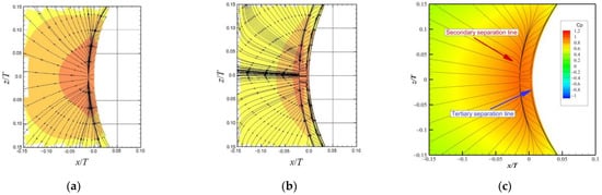 Devenport and Simpson [4] observed a small region of secondary separation in the corner region between the wall and the wing at x/T ≈ −0.025 from the corner in the symmetry plane. Ryu et al. [27], using a combination of LES and RANS, and Alberts [31], using wall-resolved LES, captured the secondary separation line, as shown in Figure 6a,b, respectively. In the results from wall-resolved LES (Figure 6b), a tertiary line of separation is also observed, corresponding to a tertiary corner vortex, which is not found in the RANS/LES results (Figure 6a). Figure 6c shows that, similarly to wall-resolved LES, the SLA-IDDES results captured both the secondary separation line at x/T = −0.025 and the tertiary separation line at x/T ≈ −0.005.