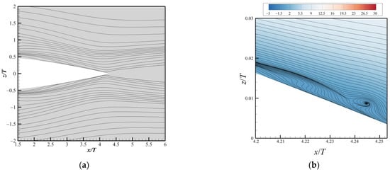 Streamlines on bottom wall calculated using SLA-IDDES: (a) streamlines with a fishtail shape at trailing edge; (b) flow separation at the trailing edge, colored by the streamwise velocity.