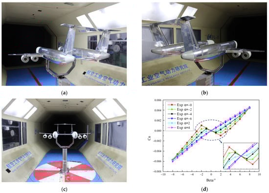 Experimental model of the demonstration aircraft in a wind tunnel: (a) left side of the aircraft; (b) right side of the aircraft; (c) front of the aircraft; (d) results for coefficient of yaw moment.