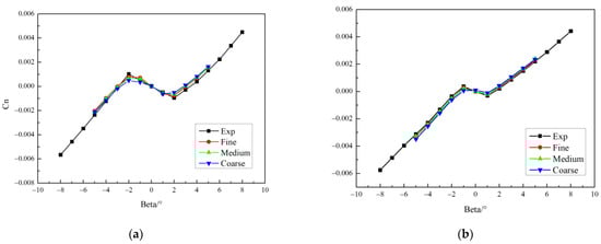 Coefficient of yaw moment calculated with three different grids, and comparison with the experimental results. (a) α = 0° (b) = −4°.