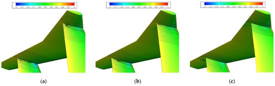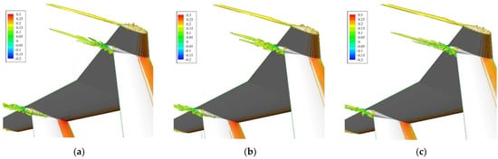 At a sideslip angle of 4°, the Cp distribution shows that the right vertical tail part of the modified model exhibits strong suction at the leading edge, whereas the original model exhibits very low suction from the leading edge to the trailing edge, because of flow separation, as shown in Figure 23c; the left vertical tail part of the modified model also shows a small suction, but the original model does not. Therefore, the failure of the vertical tail parts is due to flow separation on the suction side weakening the suction peak and finally causing the aircraft to lose SDS.