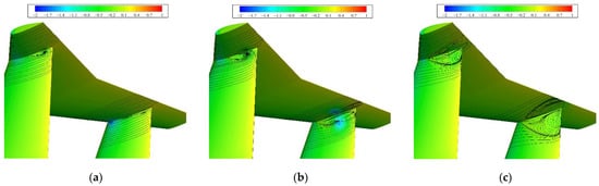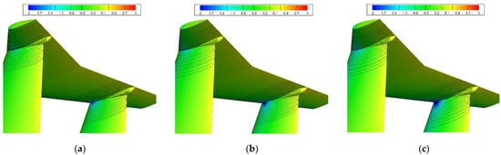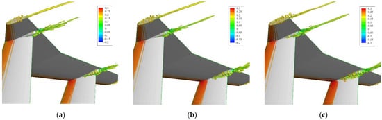 To see clearly the flow separation in the junction regions, we use an Ω isosurface [32] to analyze the flow detail. Figure 13 and Figure 14 show the Ω = 0.52 isosurface colored by the streamwise velocity normalized by the incoming velocity. Clearly, the separation regions on the suction side grow with an increasing sideslip angle. Separation begins after the point of maximum thickness of the local airfoil used for the vertical and horizontal tail parts; with an increasing sideslip angle, the separation start point moves upstream and the separation region grows sharply; and when the sideslip angle exceeds 2°, the separation shows a strong vortex–structure flow in the wake and even comes into contact with the horizontal tail part. Meanwhile, the separation vortices on the pressure side are limited in the junction regions by the incoming flow and have a limited effect on the vertical and horizontal tail parts, and with an increasing sideslip angle the separation is eliminated.