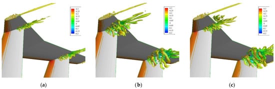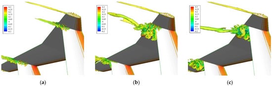 Ω = 0.52 isosurface, looking from the suction side of vertical tail parts: β = (a) 0°, (b) 2°, and (c) 4°.